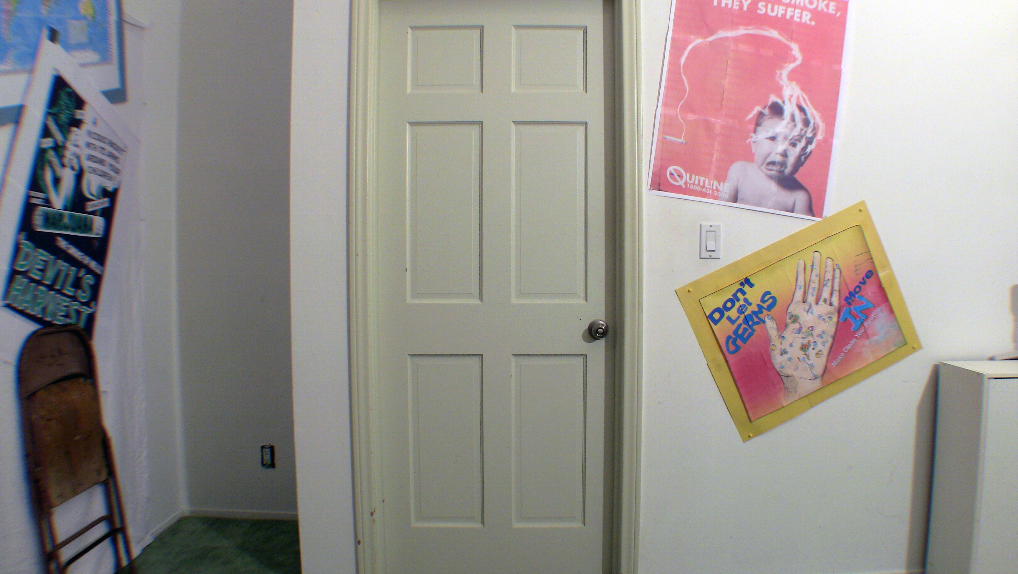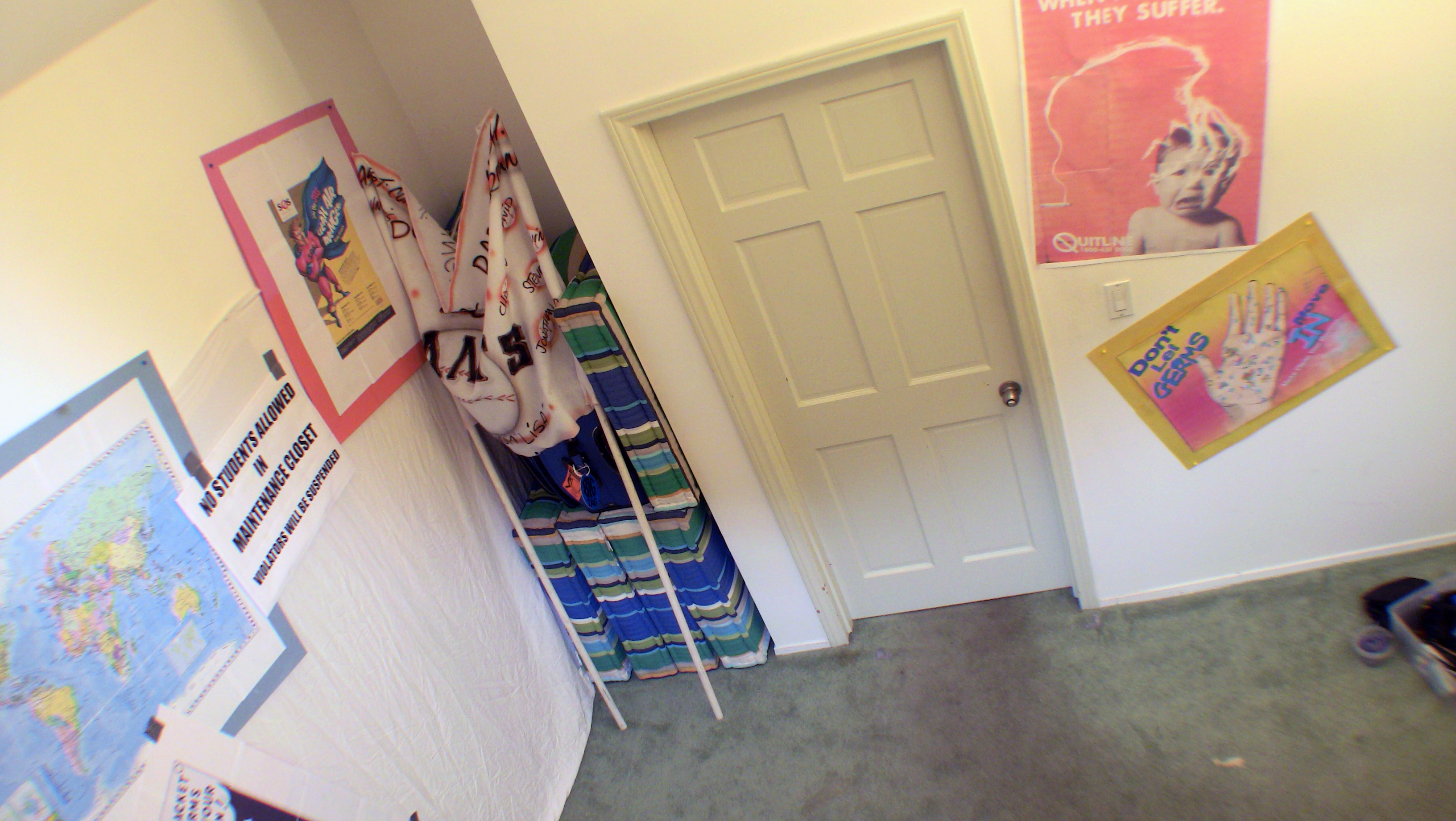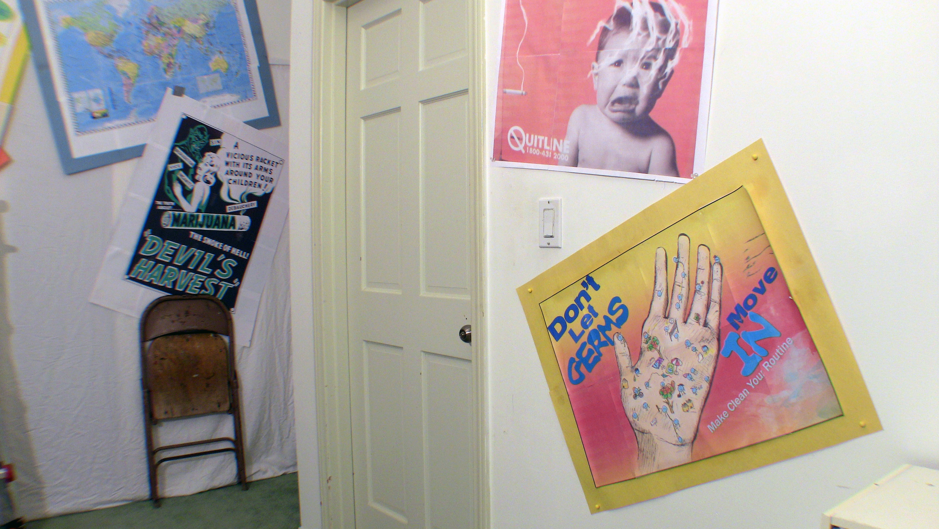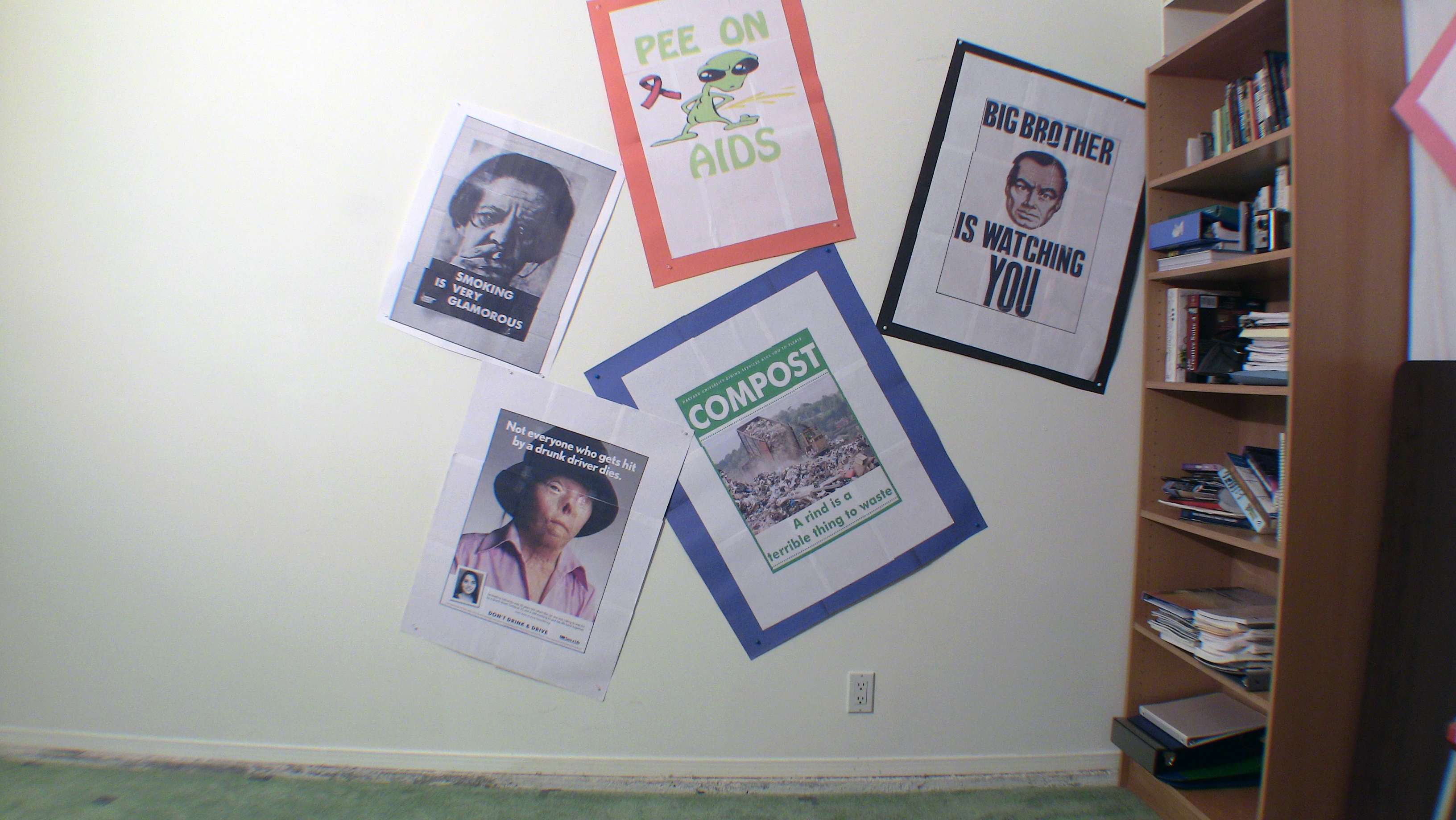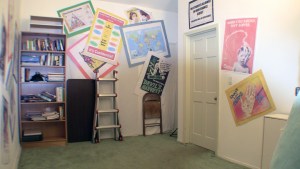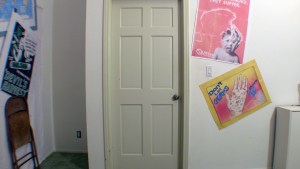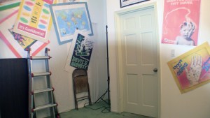 Okay. I made and mounted some more posters on the walls and I think the backgrounds are looking pretty swell. I have 7 camera set-ups altogether. I may be able to merge setups 2 and 3, but I won’t until the set is dressed.