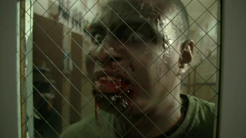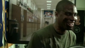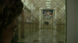 One of the things I discovered when creating the look of the set (with designer Brian Jainese) was that we had this cool window in the door of the closet, but one needed to be able to look out that window and not see, well, my office equipment. We solved the problem by finding a fairly high resolution photograph of a school hallway (complete with lockers), blew it up to 36″ wide by 24″ high and pasted it onto a piece of foamcore. We mounted the foamcore onto a 40″ C stand using a Cardellini clamp. By lighting the poster to approximate fluorescent lights (using Lee Filter #219 Fluourescent Green over a Lowel DP Pro Spot w/ 500w bulb), we established a pretty good illusion that there was a hallway outside the window. Take a look: