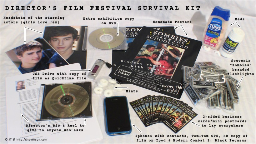 Exciting weekend coming up… my short film “Zombies Take The Schoolyard” is screening twice, at opposite ends of the country! On Friday October 22 at the Sacramento Horror Film Festival, and on Sunday October 24 at the Washington D.C. International Horror Film Festival. I’ll be able to attend the Sacramento show but not the Washington D.C. screening, unfortunately. But it’s my first film fest attended as a submitting director, so I put together a little Survival Kit that I hope will help me represent myself and my film. Please let me know if I forgot anything!