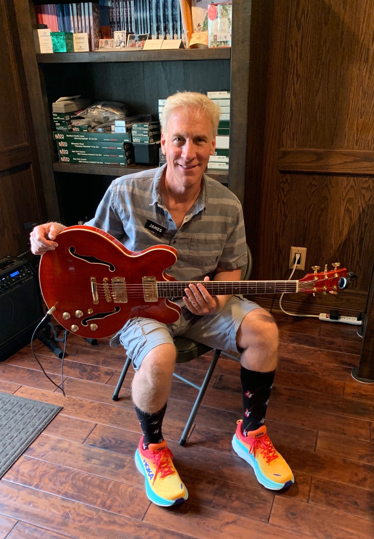 His compositions are mostly instrumental; but James confesses, “Just because I can’t sing, doesn’t mean I won’t.” He channels themes similar to those in his screenwriting: yearning, rebellion, reckoning. He records all his music and produces videos for each composition, often integrating narrative and imagery to heighten the emotional impact. These videos are available on his YouTube channel James’s Guitar and Recording Channel: